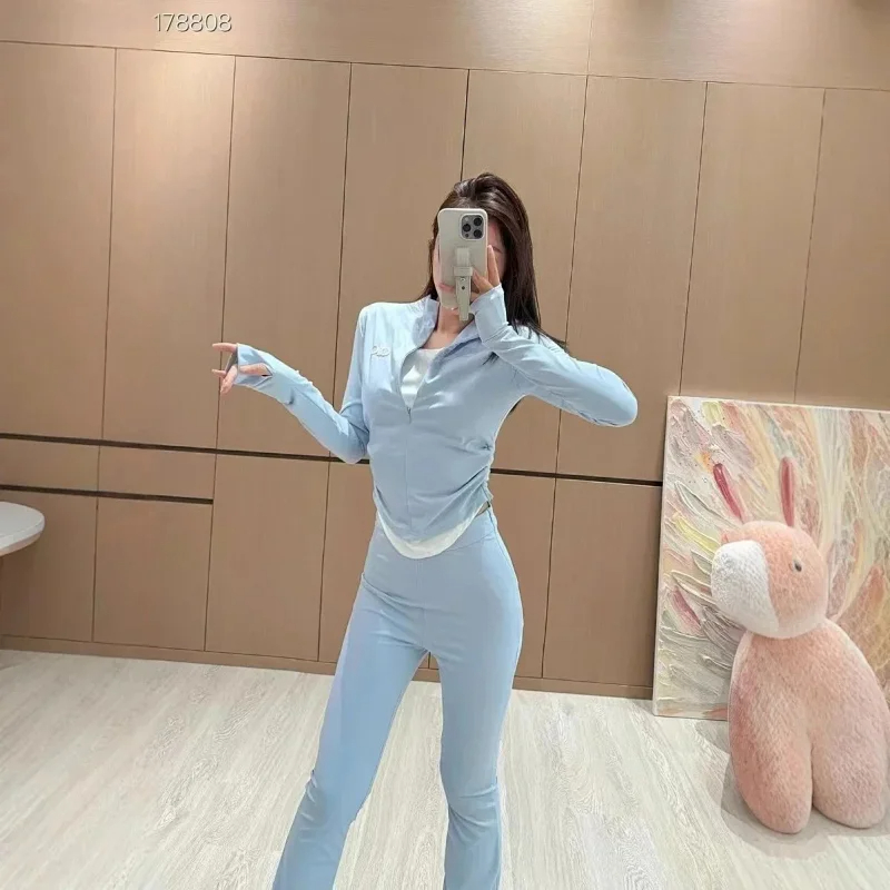 ALO 2025 Stand-up Collar Fake Two-Piece Elastic Waist Flared Pants Casual Sports Suit (3 styles)-2579