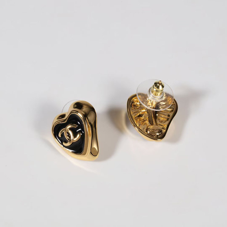 Chanel black enamel love double C gold edge earrings-3739