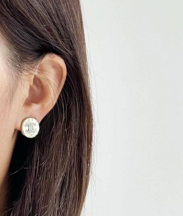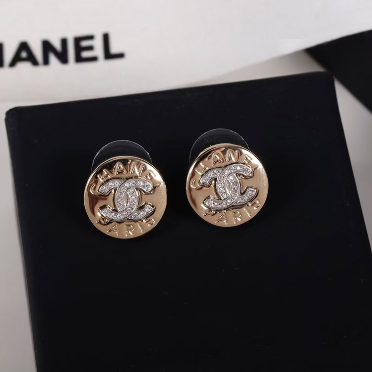 Chanel gold round double c rhinestone letter gold coin earrings-3741
